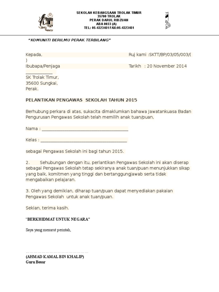 Contoh Surat Lantikan Pengawas Sekolah 2019. Pada zaman ini, di mana e-mel dan mesej teks telah pun mengambil alih trend menulis surat rasmi, tidak rasmi atau perniagaan, anda mungkin perlu mengetahui beberapa taktik yang berbeza untuk menulis surat. Kandungan surat akan menentukan penekanan apa diletakkan di perenggan utama.